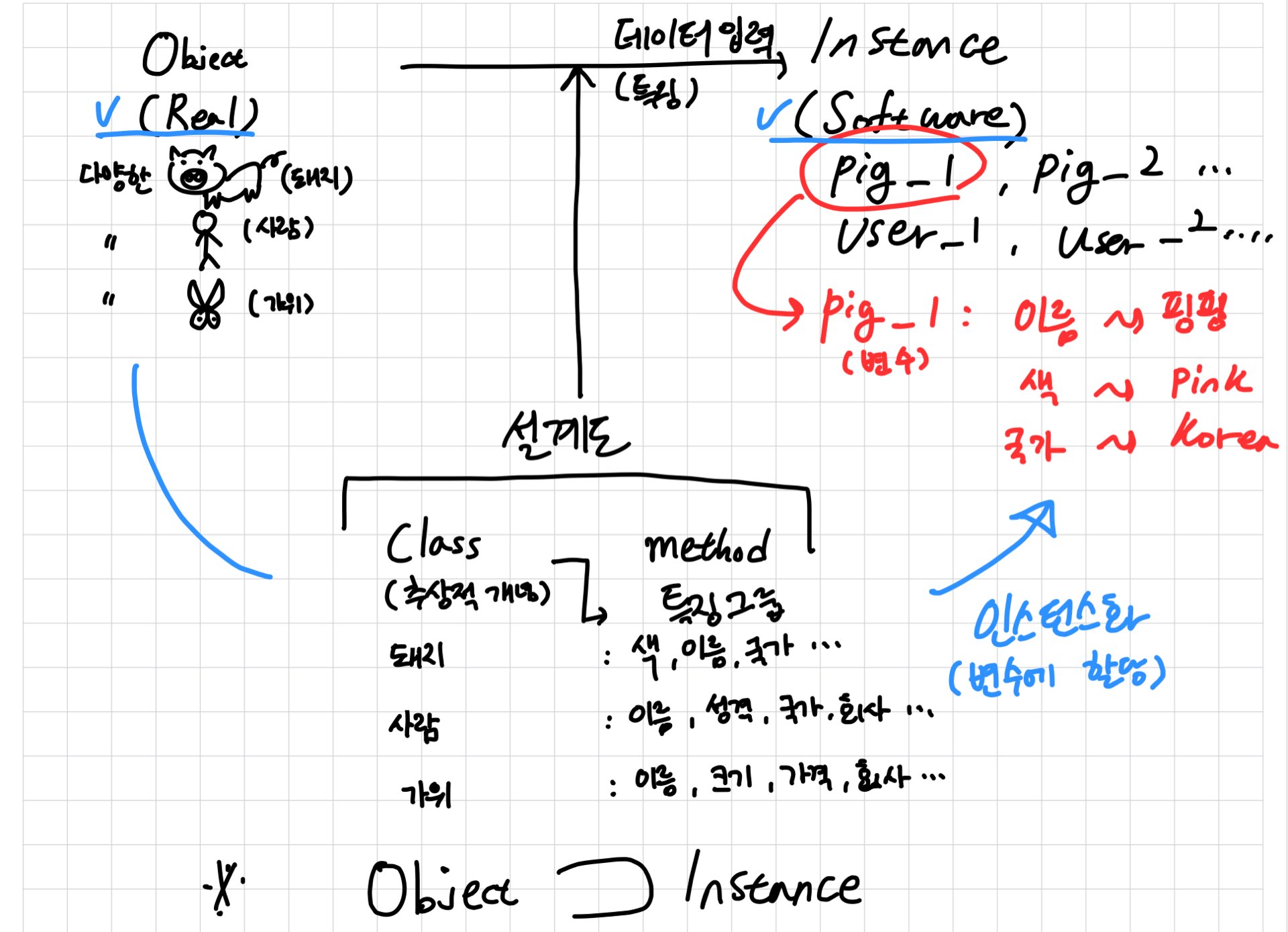즉, Object는 무수히 많은 특징이 존재한다. 계속 움직이고 변화하고 있고 모두 다른 특징종류 을 가지고 있어 모든 특징을 구체적으로 이야기 하기란 불가능하여 필요한 정보종류를 설계하여 데이터를 넣어 이야기하면 훨씬 효율적이다. 풀어서 이야기하면, Object(ex. real pig)에서 추상화 임시 개념(class, ex. pig)을 만든다(선언). 그리고 class에 필요한 특징종류(method, ex. color) 넣어 필요한 구체적 임시 개념(method가 입력된 class, ex. pig_color)을 만드는 것이다. 그래서 그 구체적 임시 개념 class 를 가지고 변수에 할당하여 특징(데이터, ex. pig_color :red)을 넣으면 Instance 라고 볼수 있다. 그리고 그 과정을 instance화라고 한다.
