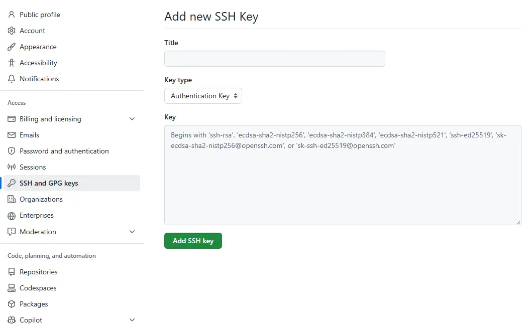 - Github > 프로필 > Settings > SSH and GPG Keys > New SSH Key