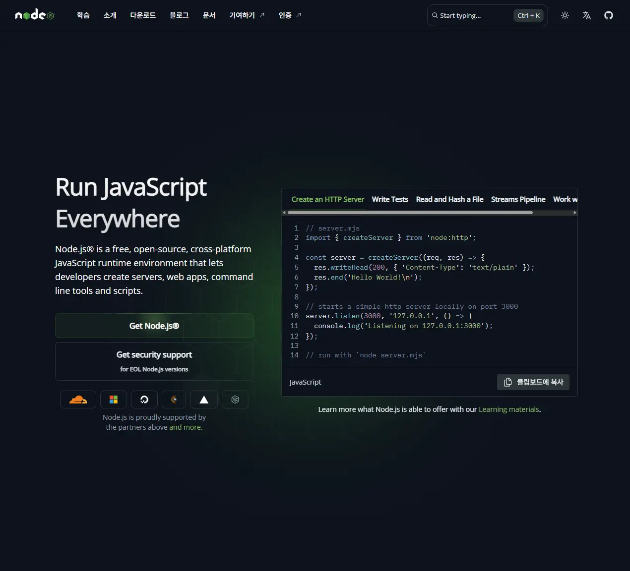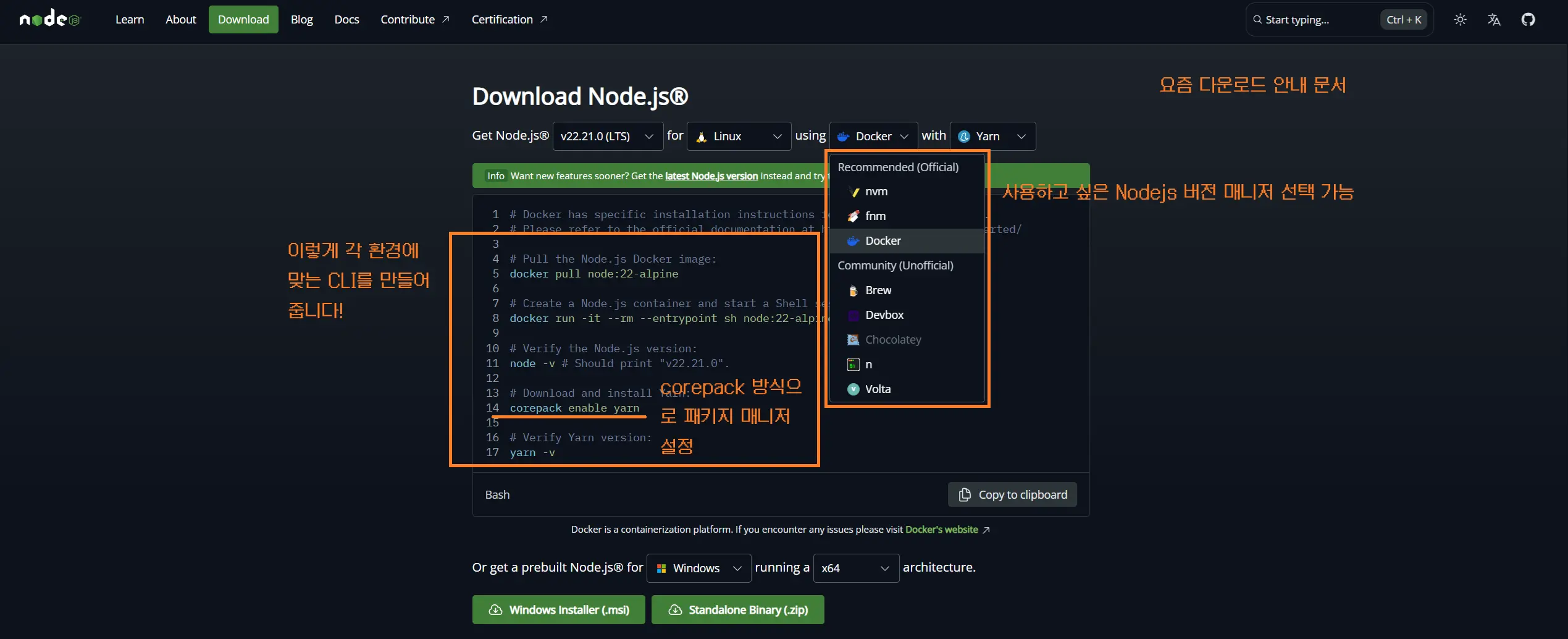 Nodejs 공식 다운로드 페이지를 확인하면, 설치하려는 Nodejs 버전, OS, Nodejs 버전 매니저 및 패키지 매니저를 설정하여 다운로드 할 수 있는 방법을 CLI로 아주 친절하게 보여주고 있습니다.