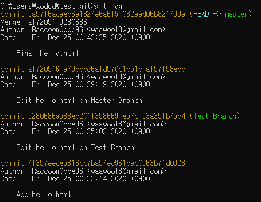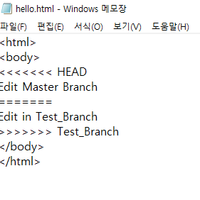 (Test Branch 수정한것 과 Master Branch 수정한 것으로 hello.html이 두가지가 있는 것 )