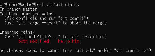 16. git status -> 양쪽에서 수정 되었다 (빨간색으로 both modified : hello.html) 로 뜸