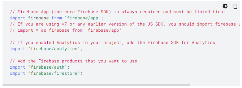 firebase.js파일 만들고config랑 initialize (export default firebase.initializeApp(firebaseConfig);)시키는 코드를 복붙 해줌 - 그리고 설치한 패키지와의 연결을 위해서 import가 필요함